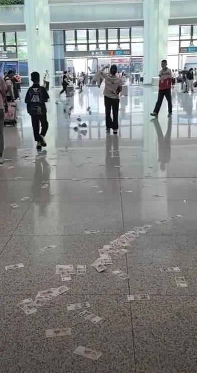 7月4日上午,广州白云高铁站西广场与地铁连接处,一名女子边走边抛撒现金。
